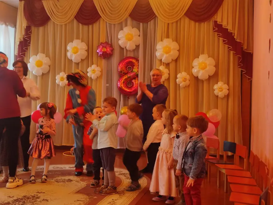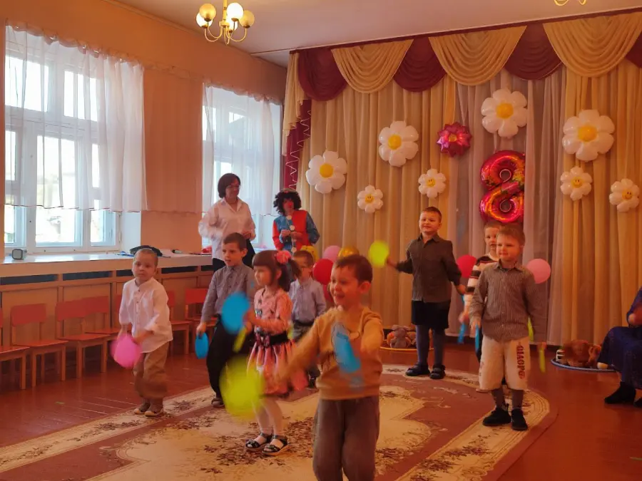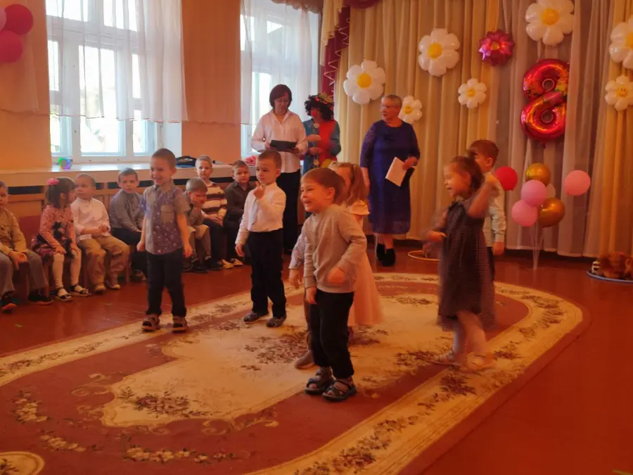 В нашем детском саду прошло праздничное мероприятие под названием "Краски весны". С большим старанием дети выступали для своих мам и бабушек, читали душевные стихи, исполняли песни, танцевали красивые танцы, участвовали в забавных конкурсах и играх. В конце праздника дети подарили любимым мамочкам цветы, сделанные своими руками. На этой прекрасной ноте завершился наш праздник, посвященный нашим дорогим и милым мамам и бабушкам. Выступление детей на празднике - это лучший подарок, который они могут получить от своих детей.